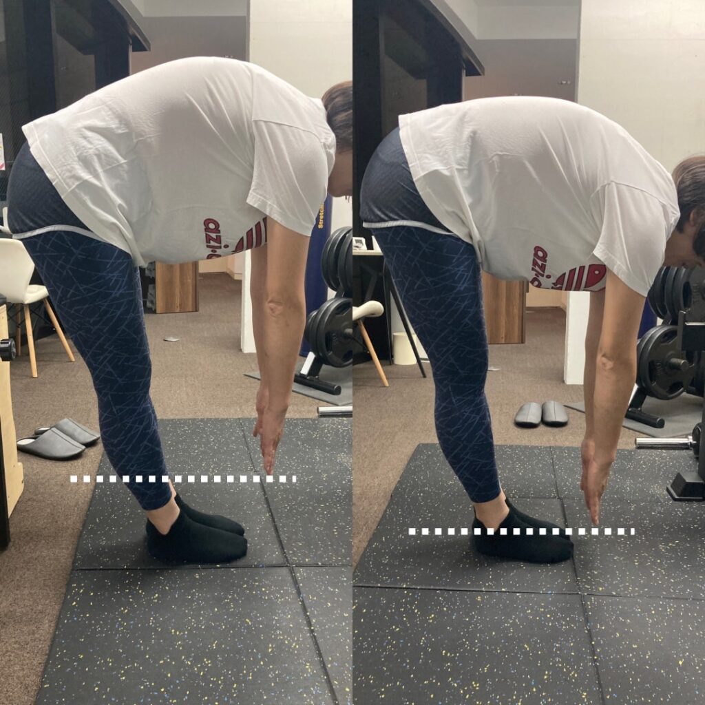 前屈が伸びることが目的ではないですが、反り腰で腰部の緊張が強い方はトレーニングによってこのような変化が出てきます。
